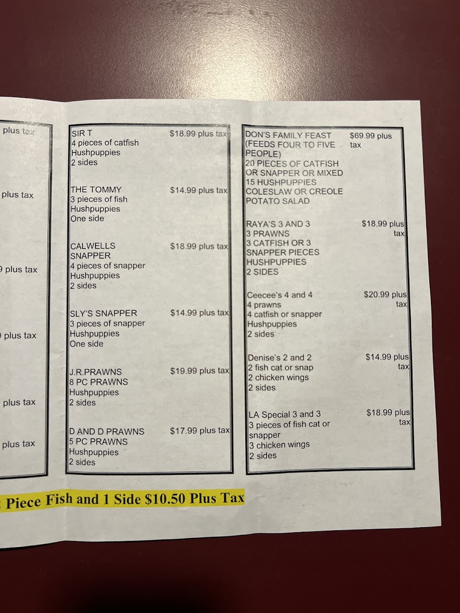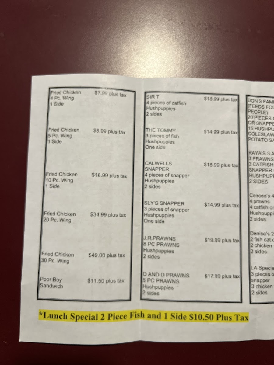 The menu at Mississippi Catfish primarily features American cuisine with a focus on seafood dishes. Visitors can expect a selection centered around catfish and other fish options, accompanied by traditional sides often found in Southern-style American dining. Portions are generally generous, suitable for casual dining occasions.